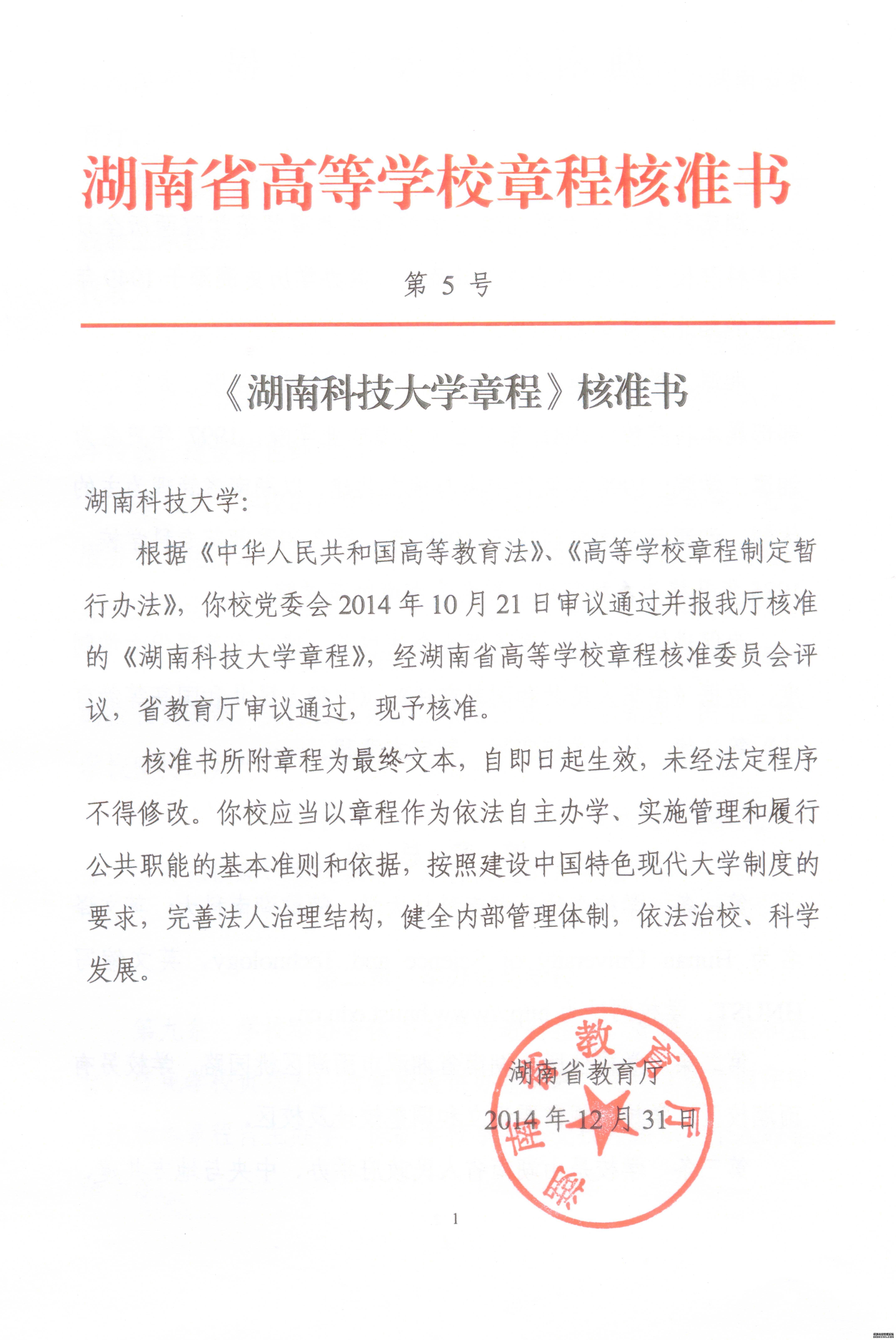 2014年12月31日,经湖南省高等学校章程核准委员会评议,省教育厅审议通过,正式下发《湖南省高等学校章程核准书》(第5号)文件,核准通过《湖南科技大学章程》。